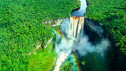 Guyana's giant foothold isn't limited to its diverse species of oversized fauna. Awe-inspiring natural wonders, including the extremely remote and powerful Sakaika Falls and the Kaieteur Falls, the largest single-drop waterfall in the world, were carved from the earth by the intricate interlocking waterways and dense rainforests of the Amazon. Guyana's national flower, the giant water lily, seen along the surface of many of the same waterways, stretches 10 feet in diameter, its massive leaves strong enough to support the weight of a young child.